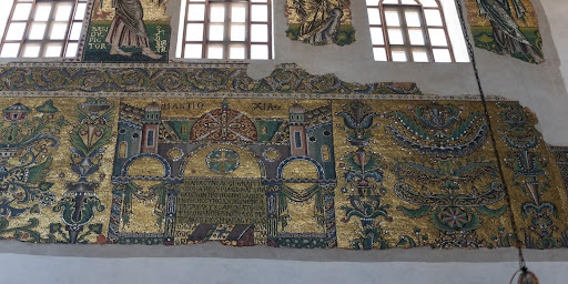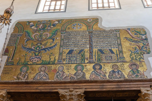 A central and unique part of the mosaics is the church council cycle, which must have been important for both sides. Even though the Orthodox and Catholic churches had already officially parted ways in the Great Schism of 1054, the event was not yet known by that name, nor was it perceived as a point of no return. Such sentiments would be solidified by the sack of Constantinople in 1204 during the Fourth Crusade, but before then both sides made many attempts at reconciliation[15]. The depictions of the church councils would have served to stress the Orthodox and Catholics' shared history and dogma through the representation of the mutually accepted seven ecumenical councils and the local Syro-Palestinian councils that worked to enforce their rulings. But wittily, the same depictions could have a second function of denouncing Catholicism in favor of the Orthodox dogma. The disagreements that had built up leading to the Great Schism can mostly be traced back to the question of papal authority and infallibility. By choosing to depict the councils, these mosaics stress the Orthodox view that all people, even the patriarchs, are subject to error, and thus no decision of doctrine can be made by any one person, but must be a joint consensus of the council[16]. Moreover, by depicting the councils aniconically, they present the theological claim that the decisions of the councils are not arbitrarily decided by the majority vote, but are rather the site of divinely-guided ruling. The church-shaped housings for the text brings it out of the human context and brings it closer to the “purest”, divine sphere of being. The repeated imagery of the gospel book represents Christ’s personal presence and sanction.