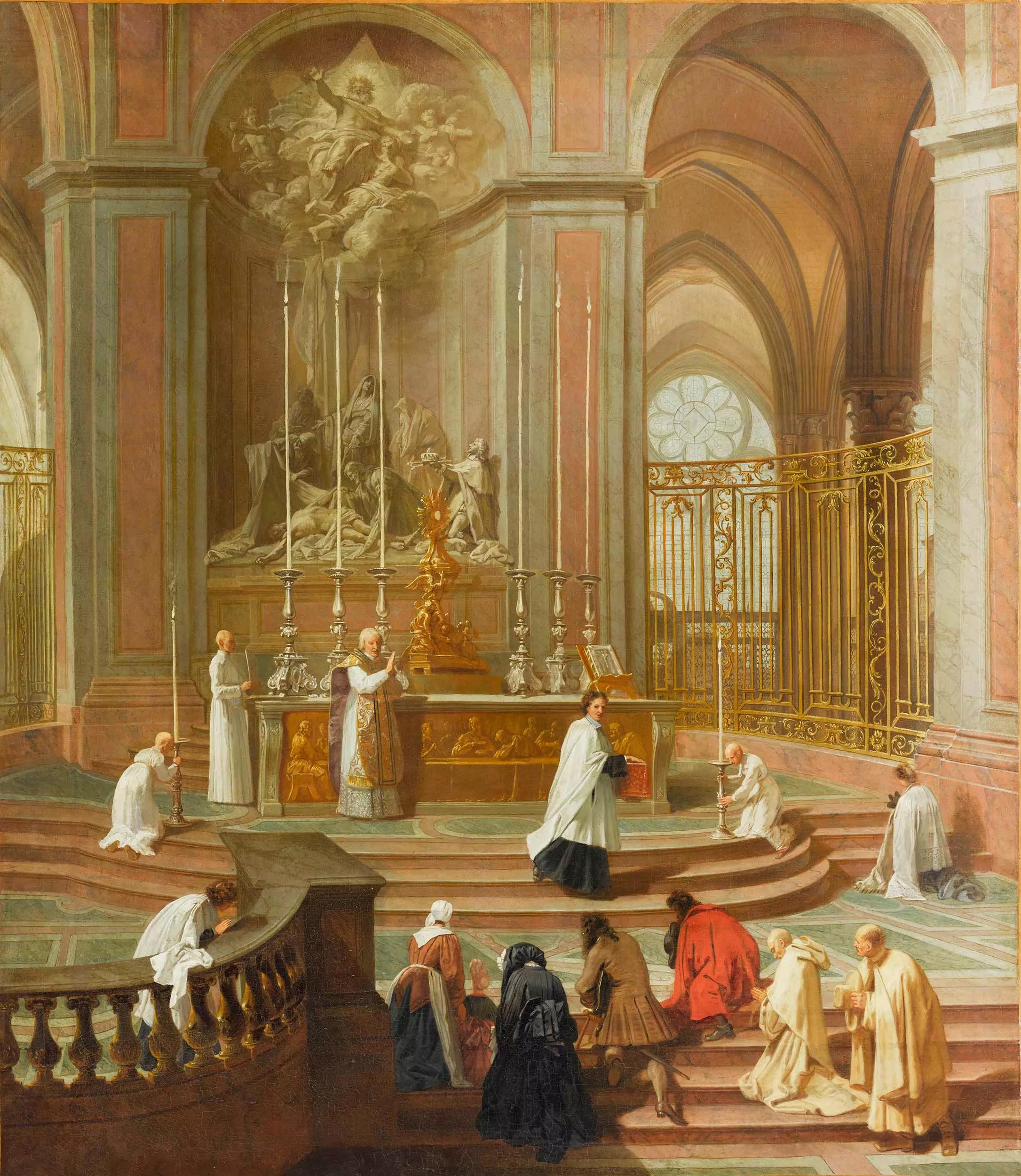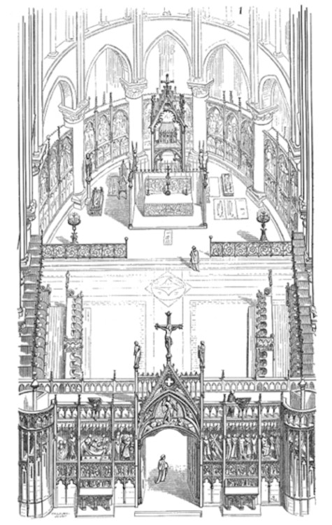 Une autre chose qui a incité au changement a été le lever de Protestantisme. Une des grandes accusations contre les catholiques était les questions autour de l'eucharistie. Pour contrer ces hérésies et pour dissiper les doutes de ses propres paroissiens, le Conseil a pris un décision d'enlever tous les jubés dans les églises. Un jubé est un mur qui sépare le chevet, ou le clergé se situait pendant la messe, de nef ou les gens laïcs étaient. Ce projet a été financé, en grand partie, par un des chanoines, Antoine de la Porte. Il donnait 10,000 livres par an pour la beautification de la cathédrale. Ça montre le niveau de soutien que le clergé avait pour ce monument et le lien entre les doctrines spécifiques et les formes architecturales. Des parties de ce jubé ont été retrouvées pendant les fouilles faites par les archéologues à Notre Dame avant de commencer les travaux de restauration. Un quantité étonnante de peinture a reste sur ces pierres, comme de rouge, de brun et de vert que vous pouvez voir ici. Et pendant les mêmes feuilles, le sépulcre d’Antoine lui-même a été trouvé au milieu de ces pièces du jubé.