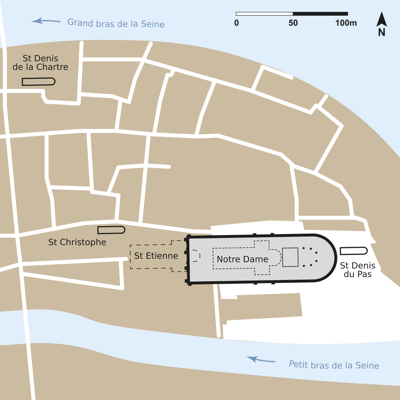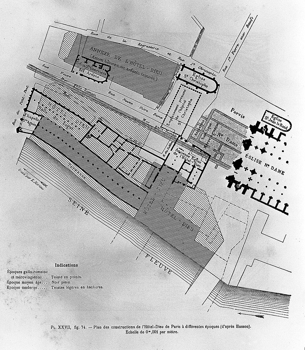 Grâce au même empire, le christianisme pouvait se diffuser entre un grande espace vitement. Pourtant, il était supprimé par les gouverneurs romains, et après le collapse d’empire dans l’Ouest, les traditions païens anciens un fois plus devinaient la norme. Les Franks sont officiellement devenus chrétiens quand leur roi Clovis reçut le baptême au début de 6e siècle de Saint Remy, et le reste suivait son exemple. La chose importante à noter ici est qu’il y avait de chrétiens et d'églises avant ca, mais tous eux étaient la minorité, les églises étaient créées grâce aux efforts privés sans l’aide de gouvernement. Clovis a été enterré à l'abbaye Sainte-Geneviève qu’il a fondu dans le cinquième arrondissement de Paris. En fait, cette abbaye a été initialement dédiée aux Saintes Peter et Paul, mais quand Saint Geneviève, une sainte fortement aimée par tous les parisiens depuis le temps de sa vie, est mouri en 512, elle a été enterré près de Clovis, et l’abbaye a été redédiée à lui. Cette abbaye avait une église sous son contrôle autour de ces murs, qui était située dans l'Île de Cité, ou maintenant est le parvis de Notre Dame.